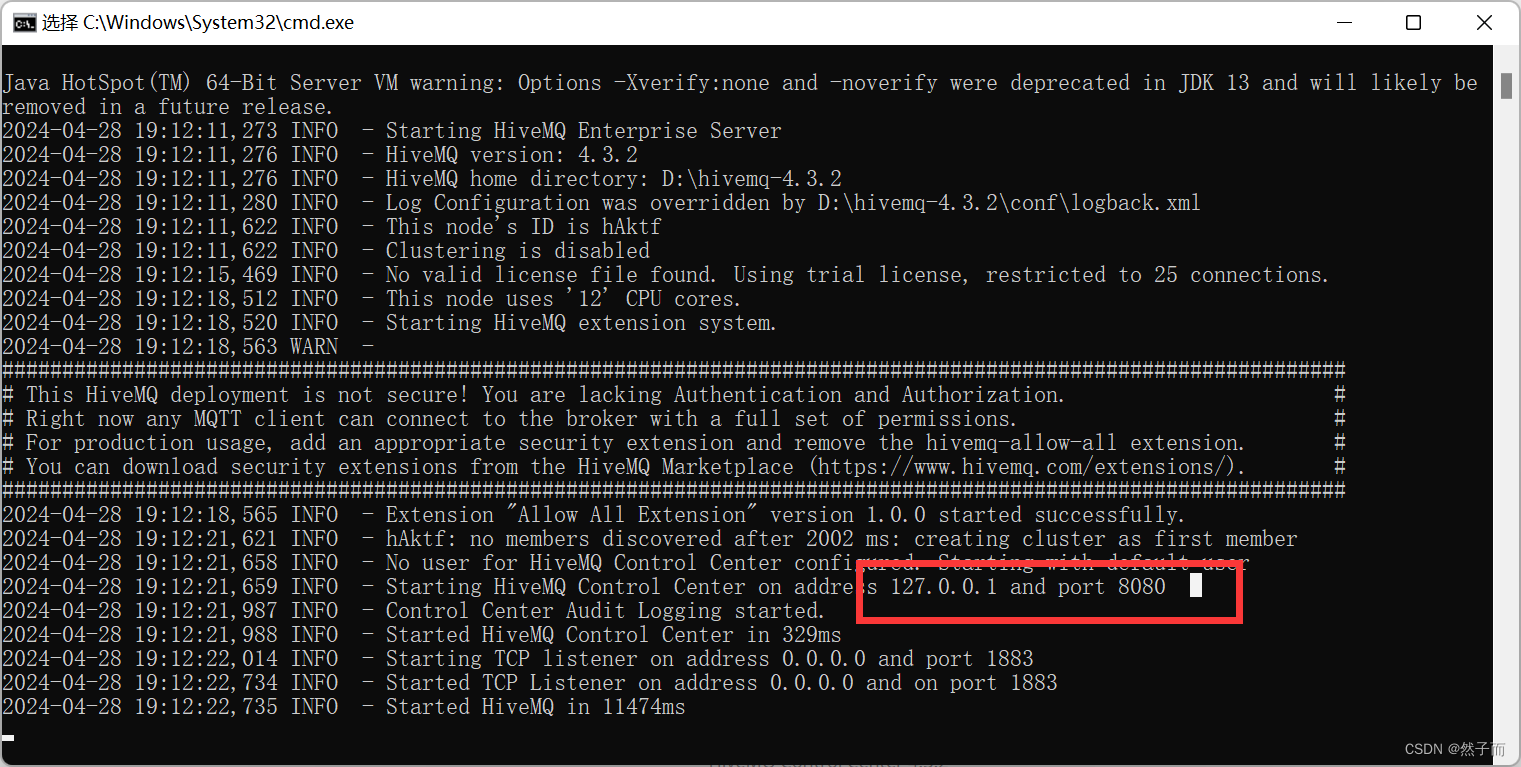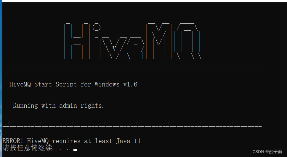 下载安装至少JDK11之后,再次点击run.bat文件,如下图所示,说明hivemq成功运行: