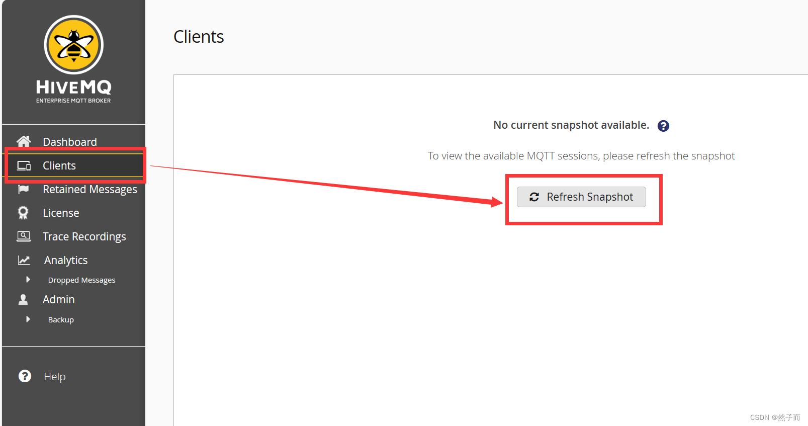 如上图所示,点击左侧的Clients,查看连接的客户端,点击Refresh Snapshot更新系统的快照。