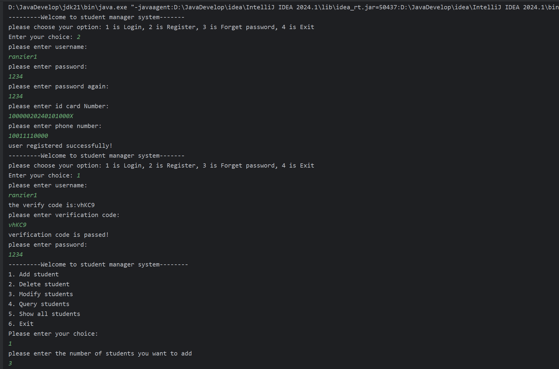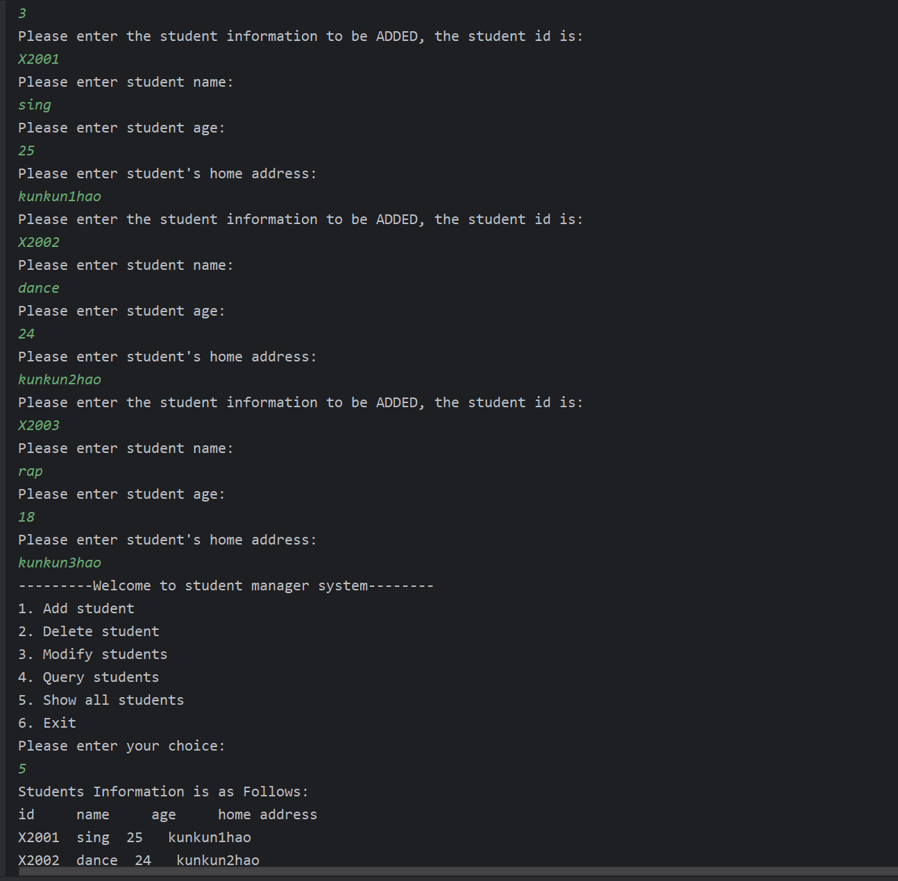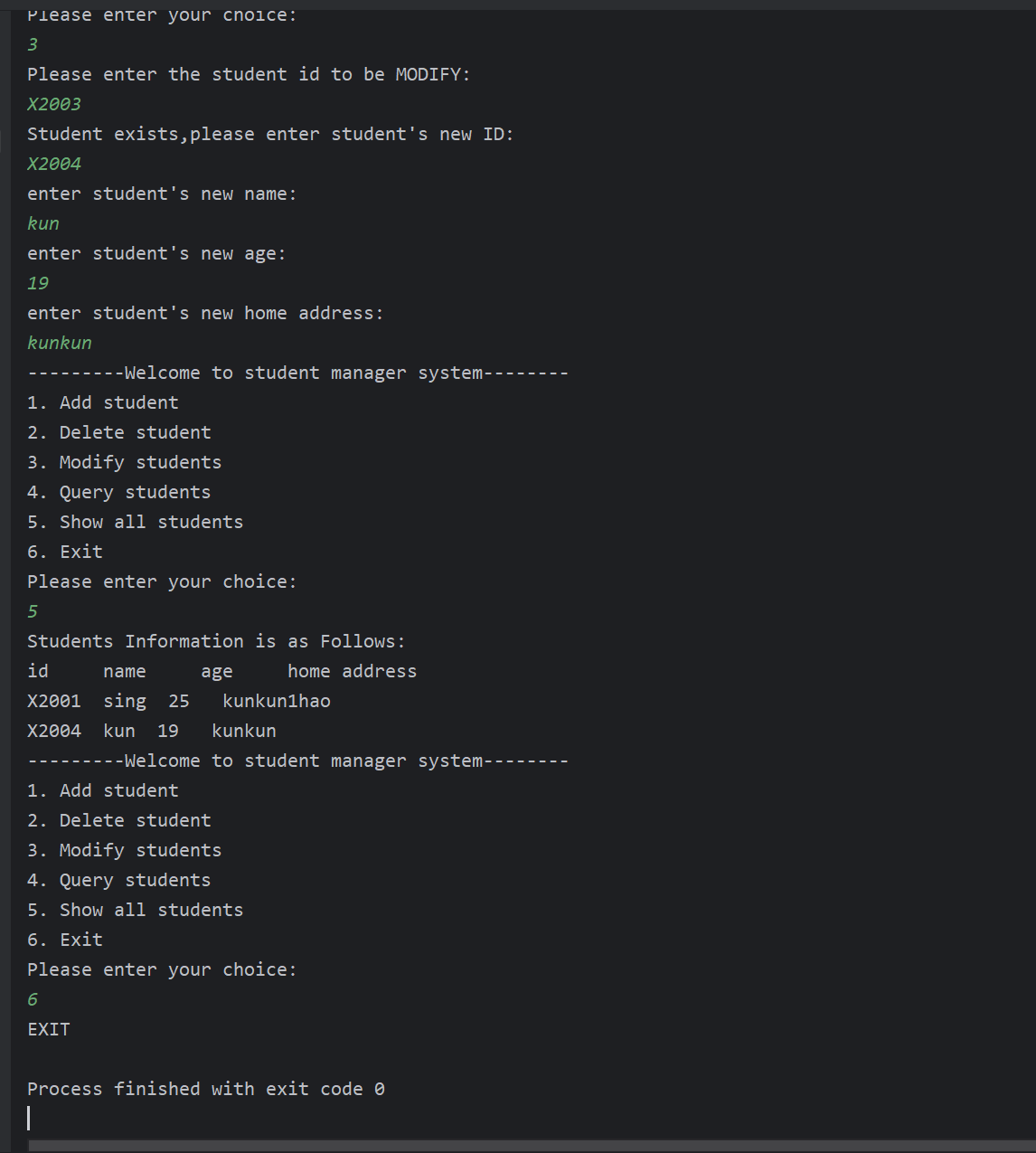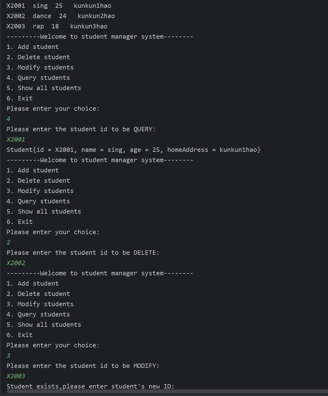 while (true) { showMenu(); Scannersc=newScanner(System.in); intchoice= sc.nextInt();//选择相应的功能 switch (choice) { case1: { System.out.println("please enter the number of students you want to add"); intnum= sc.nextInt(); for (inti=0; i < num; i++) { students = addStudent(students); } } ; break; case2: students = deleteStudent(students); break; case3: students = modifyStudent(students); break; case4: queryStudents(students); break; case5: showAllStudents(students); break; case6: System.out.println("EXIT"); return; default: System.out.println("Invalid choice"); } } }