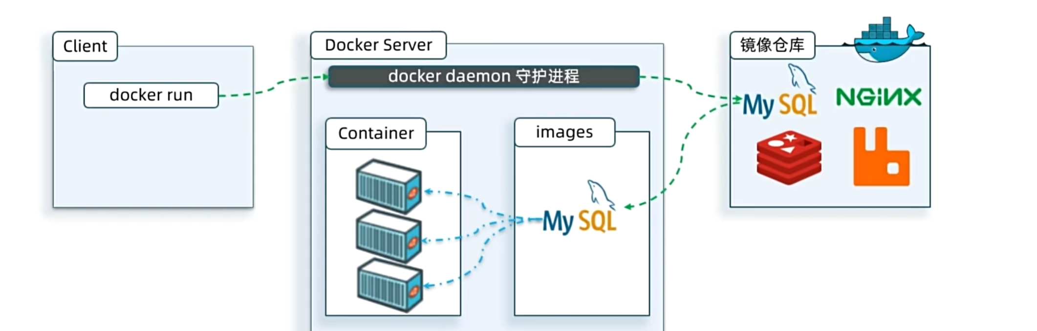 1. Docker介绍 Docker本身包含一个后台服务,我们可以利用Docker命令告诉Docker服务,帮助我们快速部署指定的应用。Docker服务部署应用时,首先要去搜索并下载应用对应的镜像,然后根据镜像创建并允许容器,应用就部署完成了。