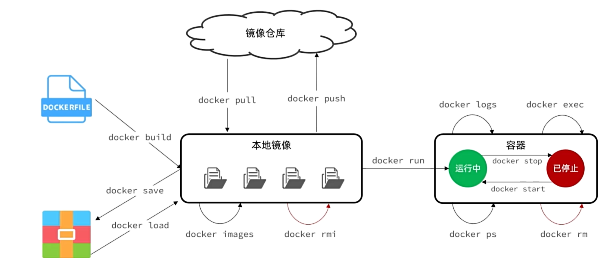 2.2 示例 1 2 3 4 5 6 7 8 9 10 11 12 13 14 15 16 17 18 19 20 21 22 23 24 25 26 27 28 29 30 31 32 33 34 35 36 37 38 39 40 41 42 43 44 45 46 docker pull nginx docker images REPOSITORY TAG IMAGE ID CREATED SIZE nginx latest 605c77e624dd 16 months ago 141MB mysql latest 3218b38490ce 17 months ago 516MB docker run -d --name nginx -p 80:80 nginx docker ps docker ps --format "table {{.ID}}\t{{.Image}}\t{{.Ports}}\t{{.Status}}\t{{.Names}}" docker stop nginx docker ps -a --format "table {{.ID}}\t{{.Image}}\t{{.Ports}}\t{{.Status}}\t{{.Names}}" docker start nginx docker ps --format "table {{.ID}}\t{{.Image}}\t{{.Ports}}\t{{.Status}}\t{{.Names}}" docker inspect nginx docker exec -it nginx bash docker exec -it mysql mysql -uroot -p docker rm nginx docker rm -f nginx