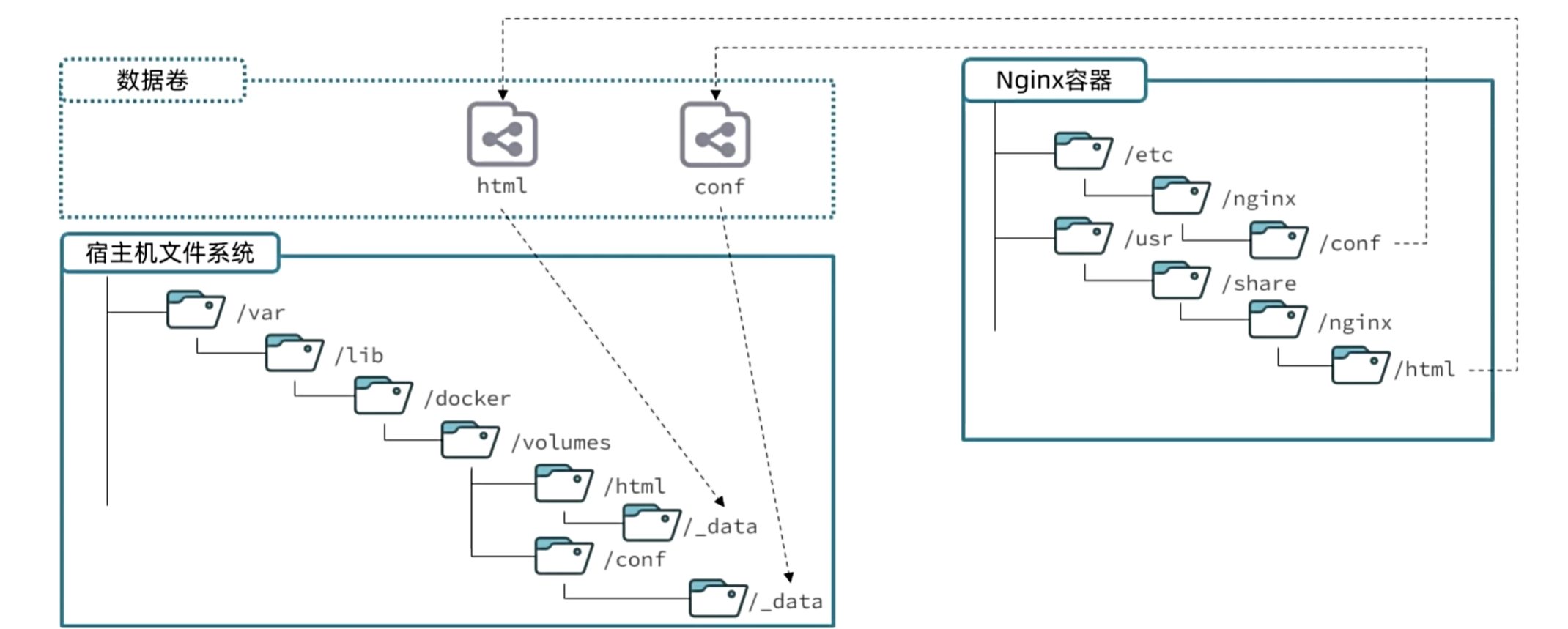 Nginx容器内部的conf目录和html目录分别与两个数据卷关联。