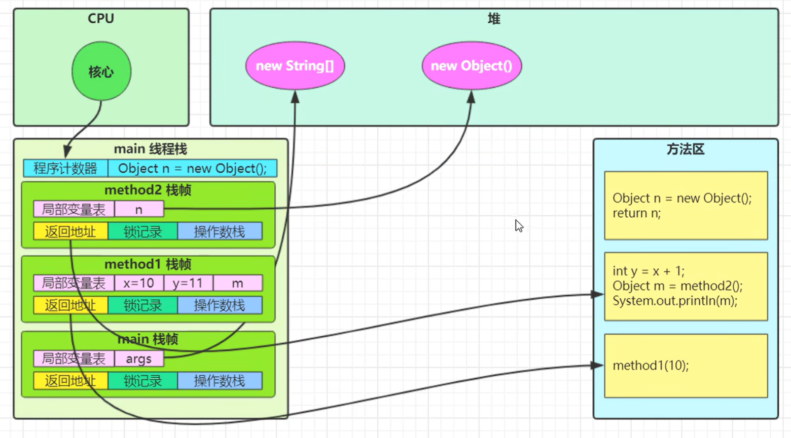 - 每个栈由多个栈帧(Frame)组成,对应着每次方法调用时所占用的内存