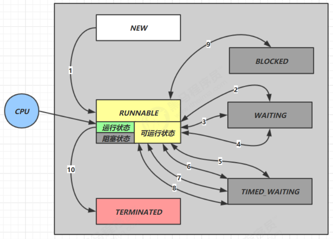 | getState() | 获取线程状态 | Java 中线程状态是用 6 个 enum 表示:NEW, RUNNABLE, BLOCKED, WAITING, TIMED_WAITING, TERMINATED。 | |