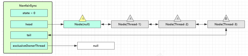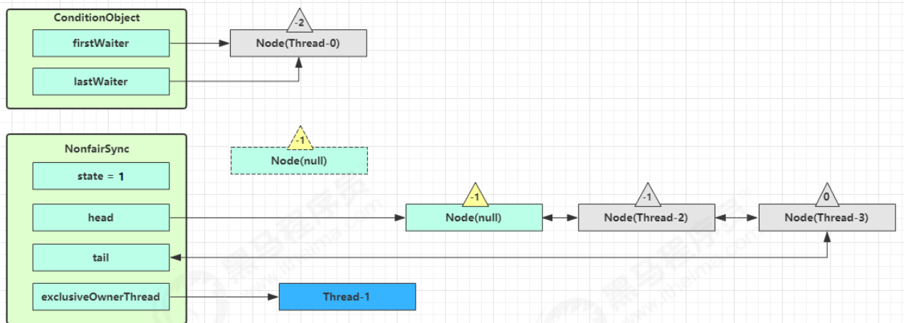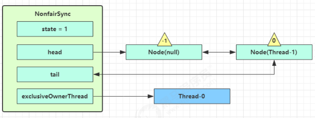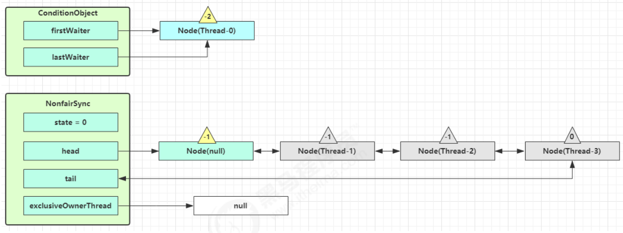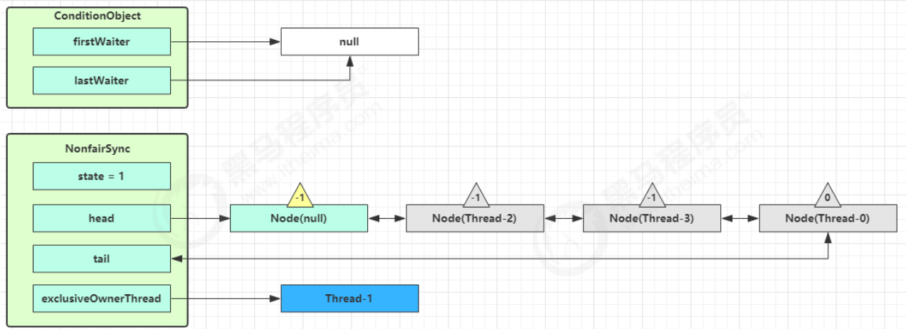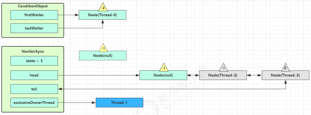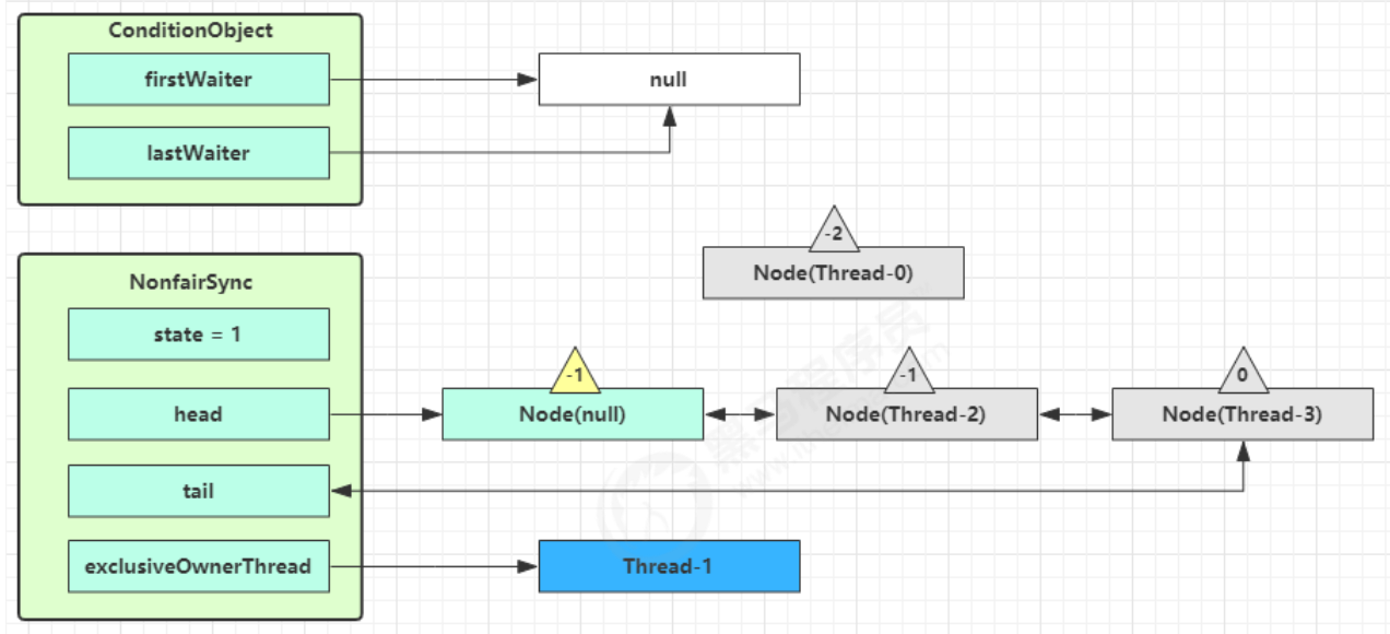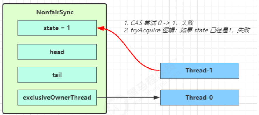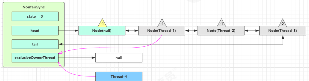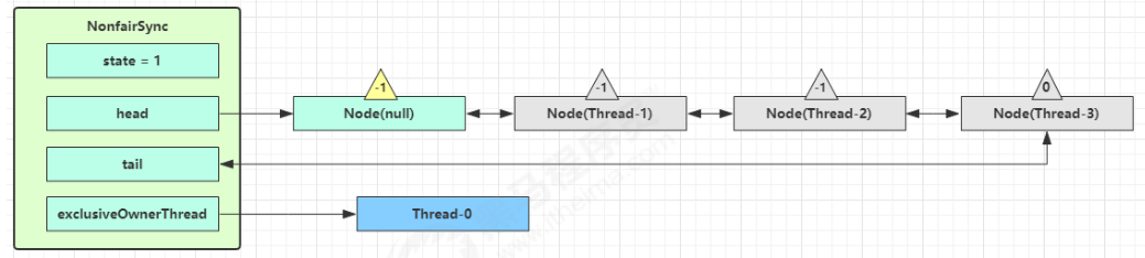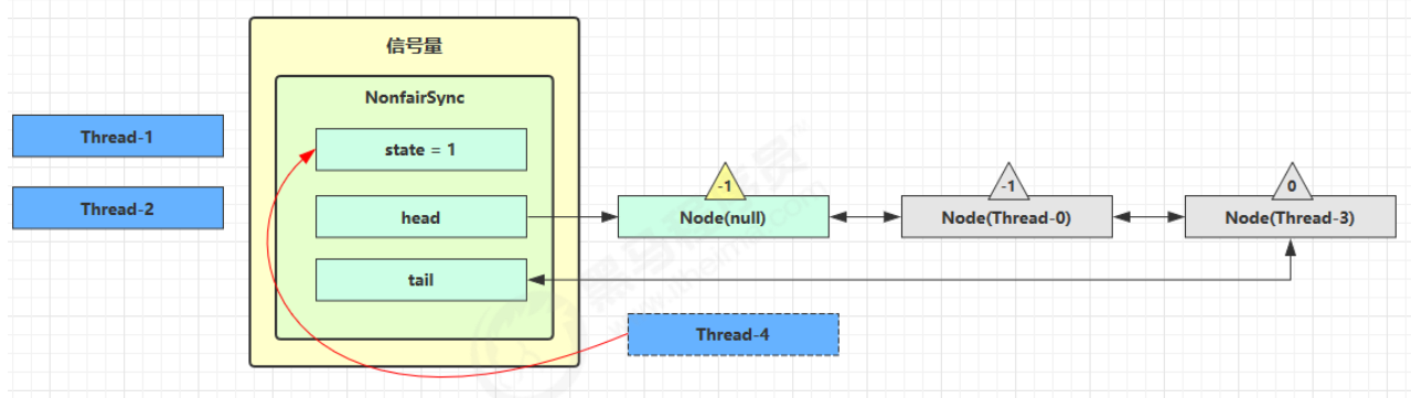 假设其中 Thread-1,Thread-2,Thread-4 cas 竞争成功,而 Thread-0 和 Thread-3 竞争失败,进入 AQS 队列park 阻塞