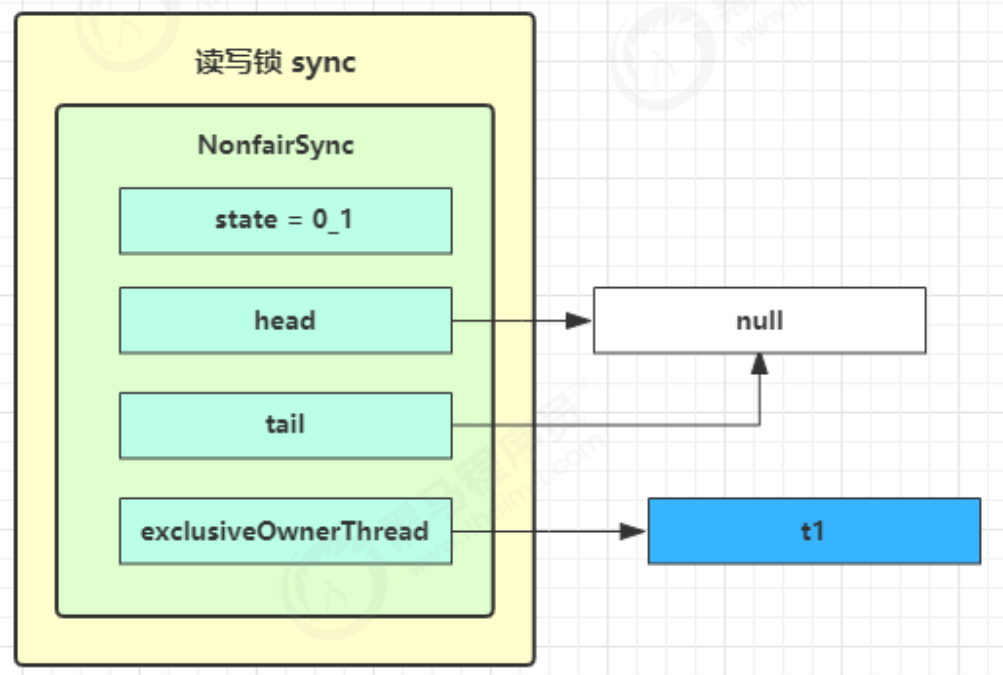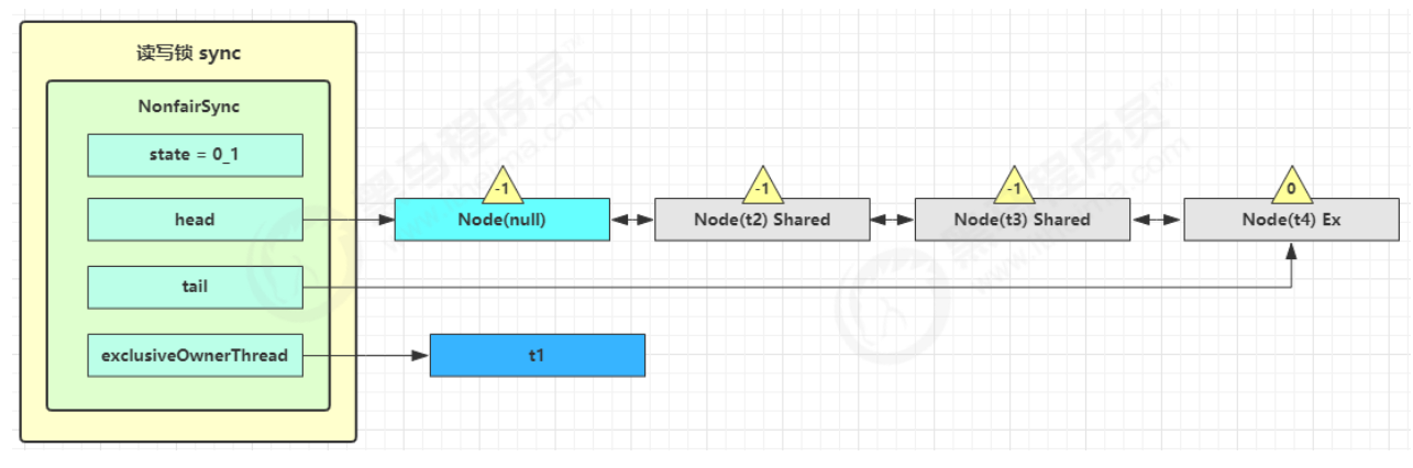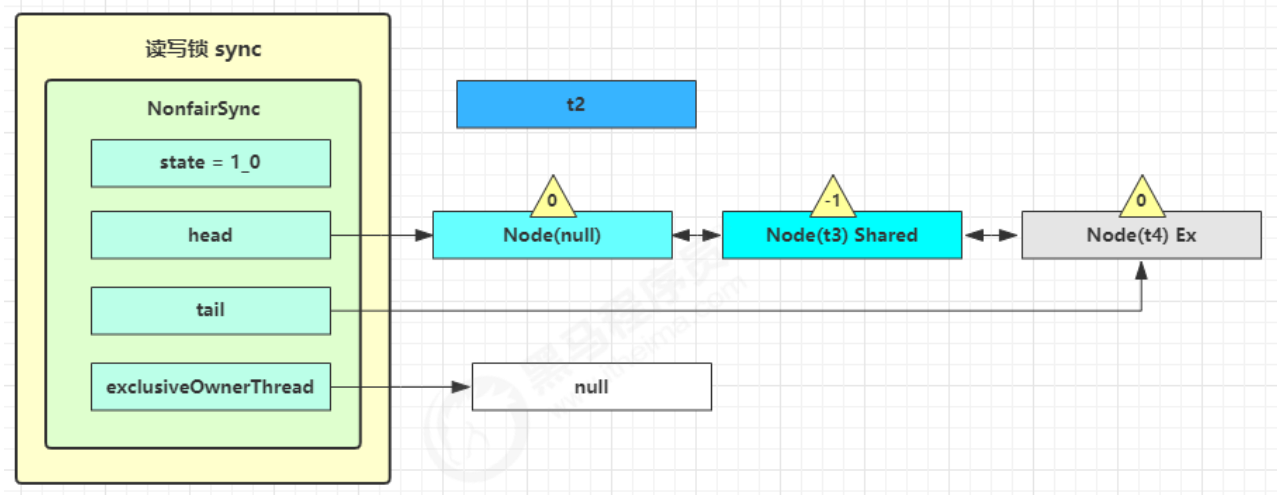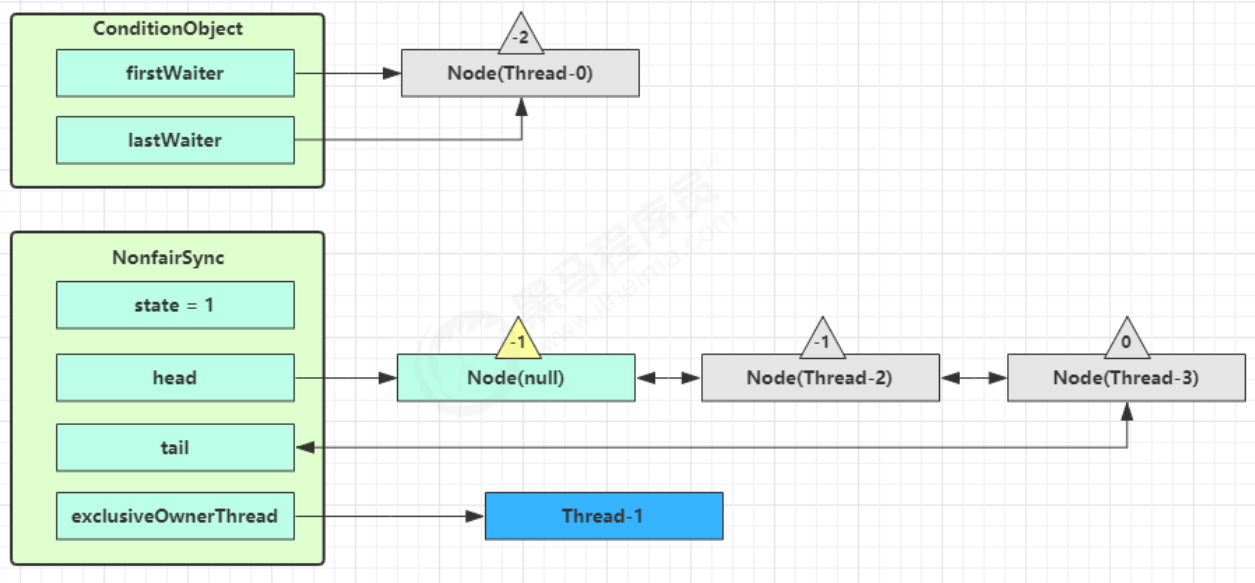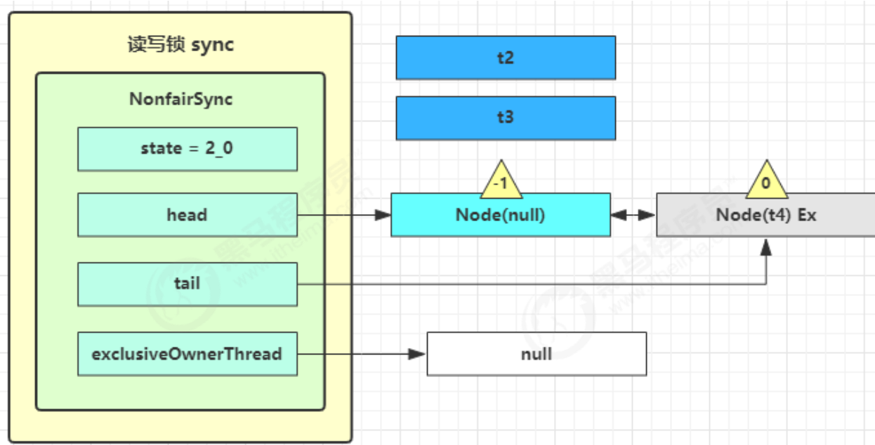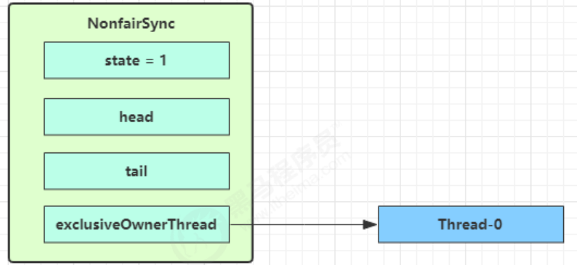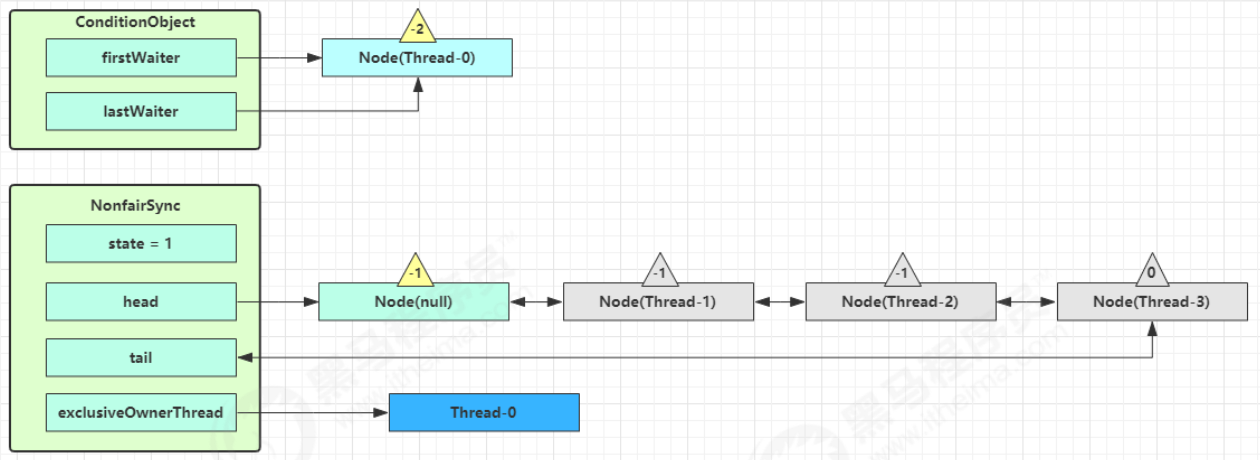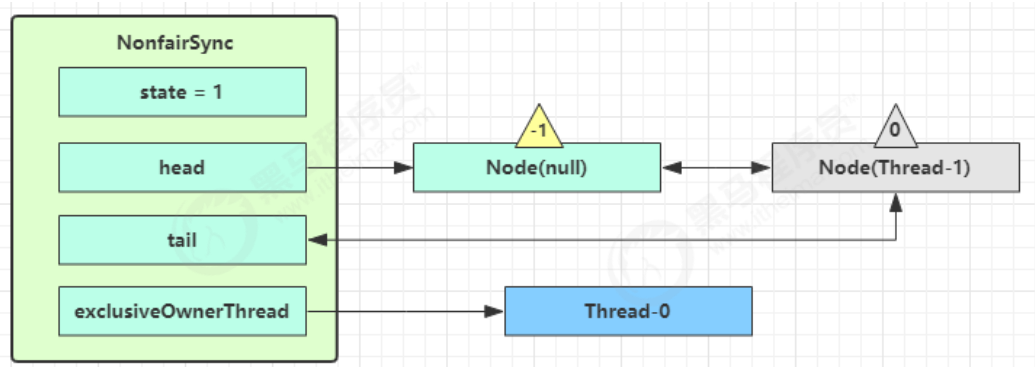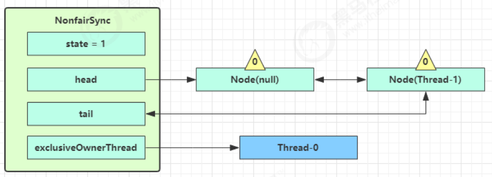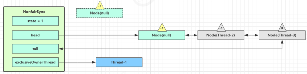 假设其中 Thread-1,Thread-2,Thread-4 cas 竞争成功,而 Thread-0 和 Thread-3 竞争失败,进入 AQS 队列park 阻塞