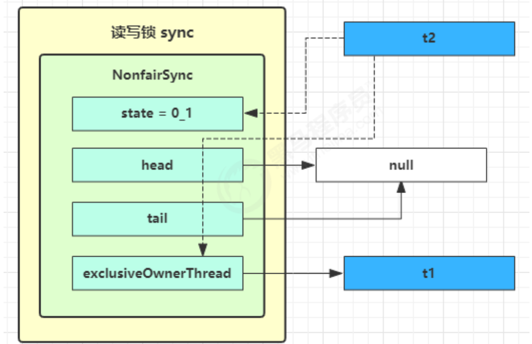 t2 进入 sync.releaseShared(1) 中,调用 tryReleaseShared(1) 让计数减一,但由于计数还不为零