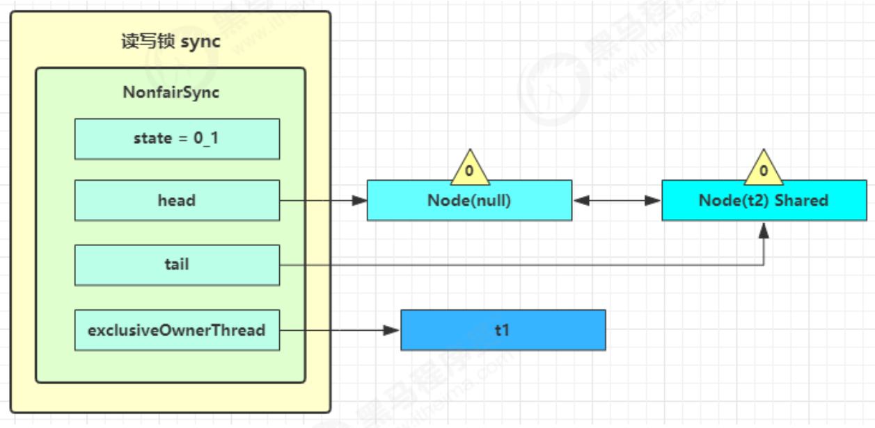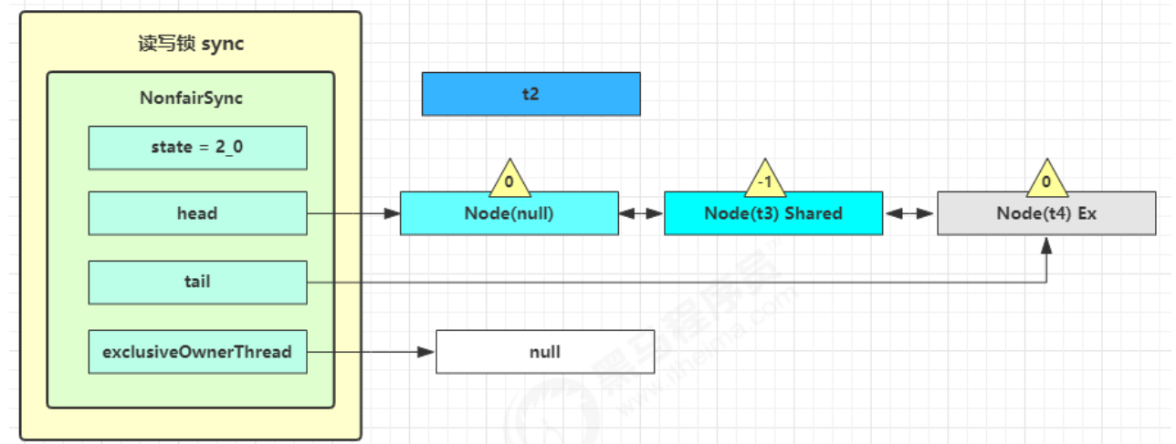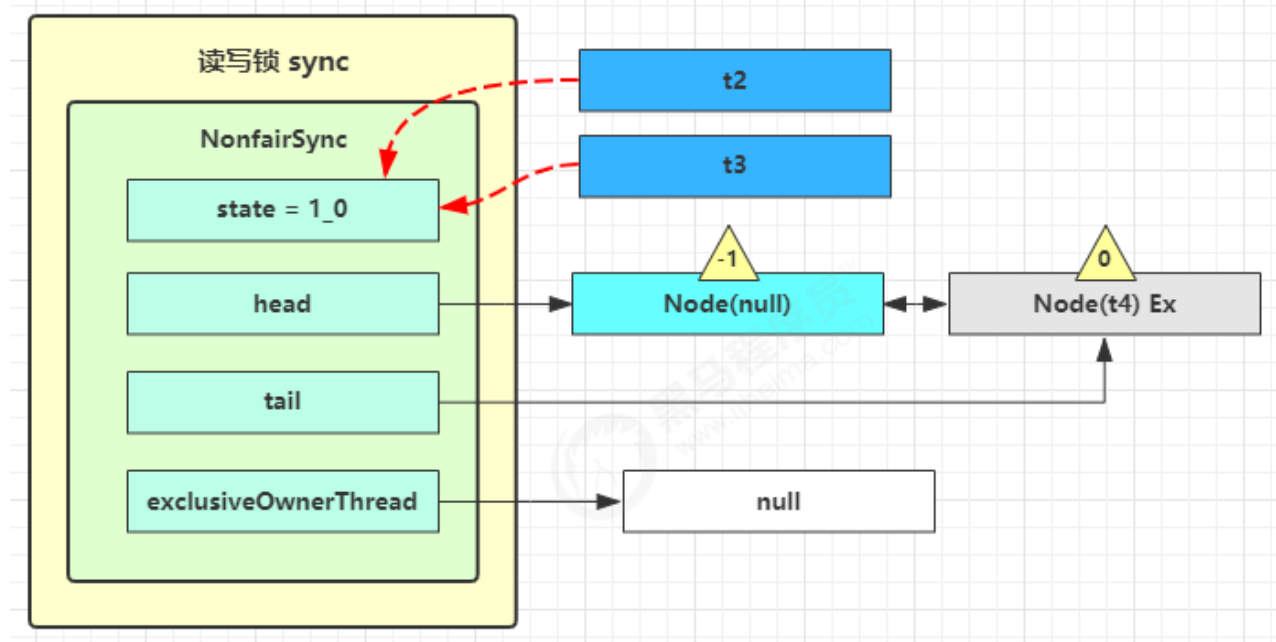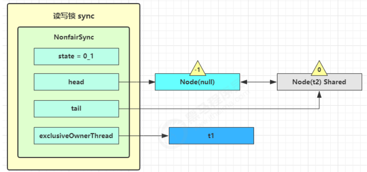 事情还没完,在 setHeadAndPropagate 方法内还会检查下一个节点是否是 shared,如果是则调用doReleaseShared() 将 head 的状态从 -1 改为 0 并唤醒老二,这时 t3 在doAcquireShared 内parkAndCheckInterrupt() 处恢复运行