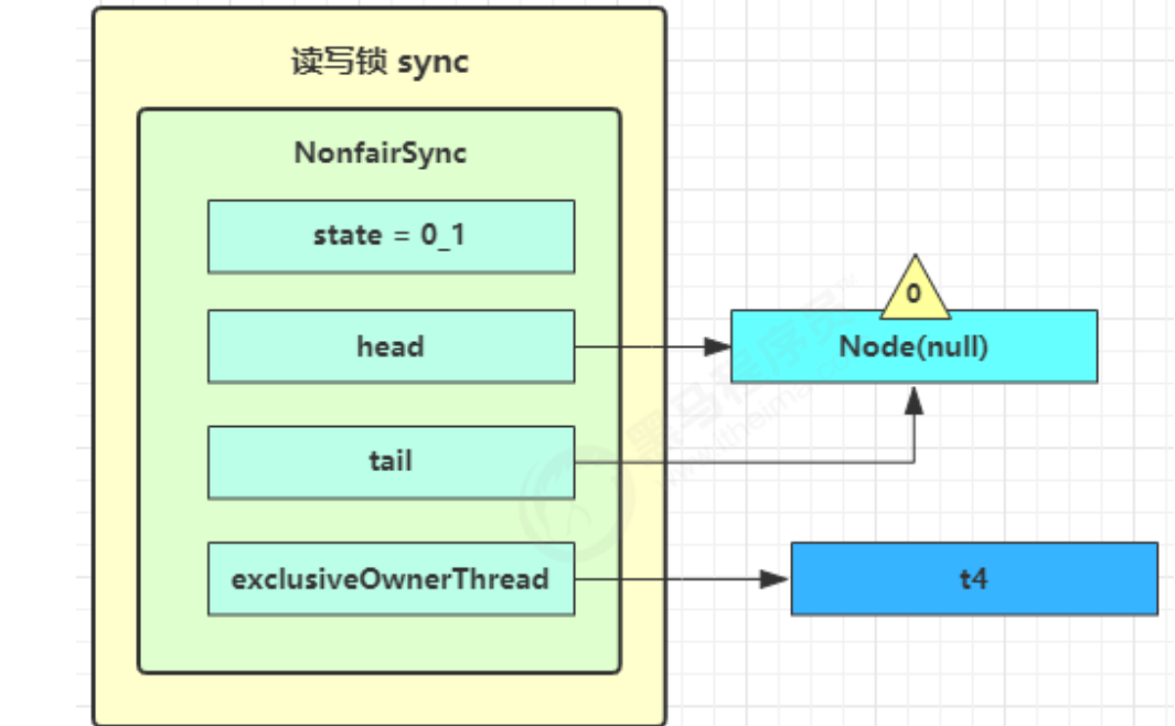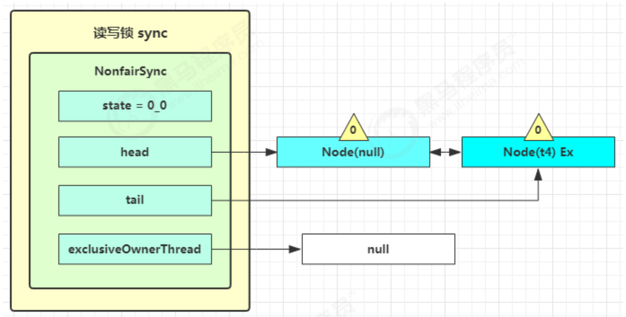 之后 t4 在 acquireQueued 中 parkAndCheckInterrupt 处恢复运行,再次 for (;;) 这次自己是老二,并且没有其他竞争,tryAcquire(1) 成功,修改头结点,流程结束