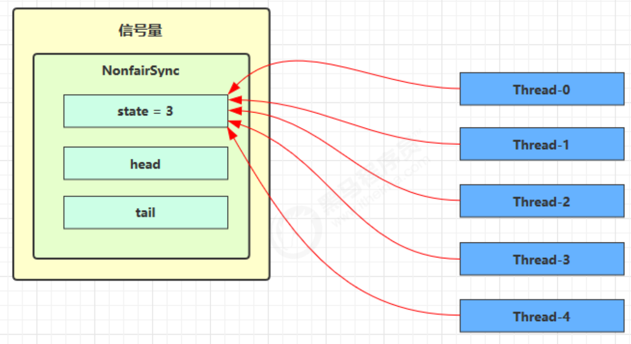 刚开始,permits(state)为 3,这时 5 个线程来获取资源