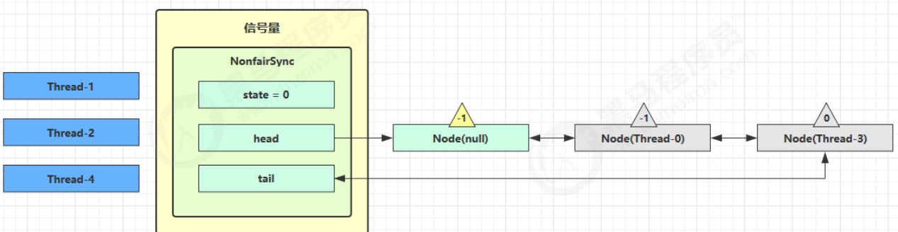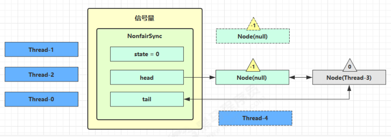 接下来 Thread-0 竞争成功,permits 再次设置为 0,设置自己为 head 节点,断开原来的 head 节点,unpark 接下来的 Thread-3 节点,但由于 permits 是 0,因此 Thread-3 在尝试不成功后再次进入 park 状态