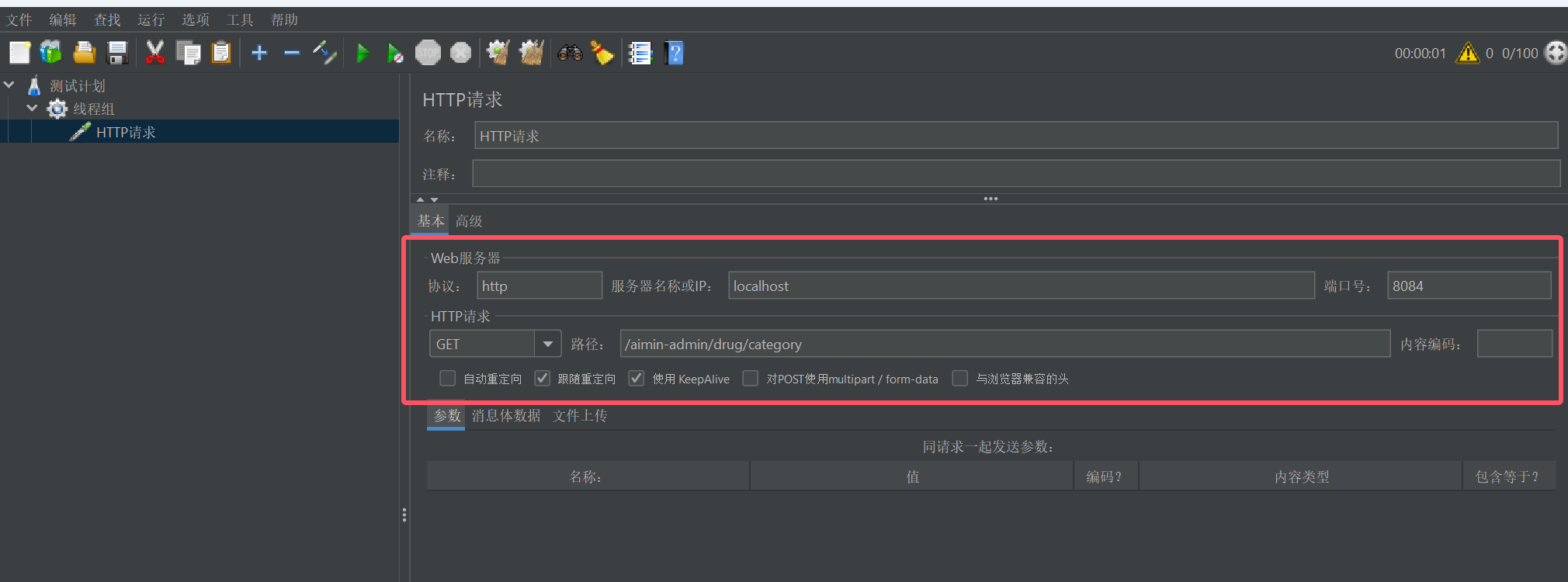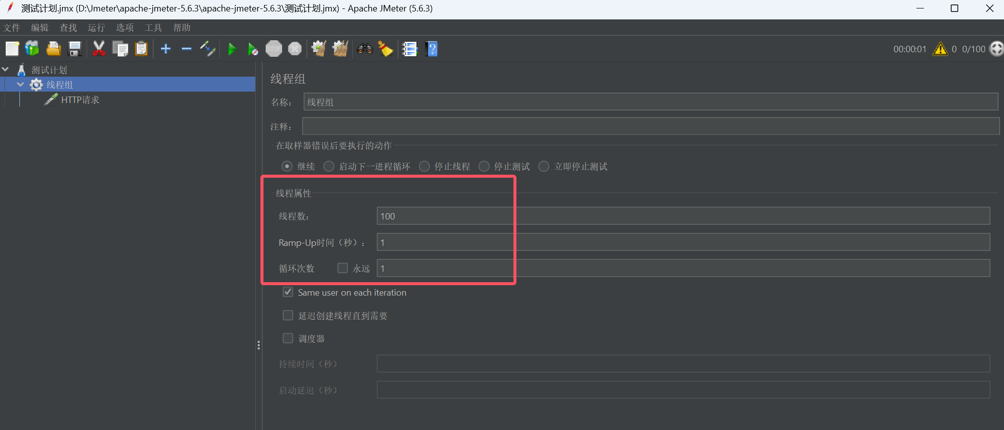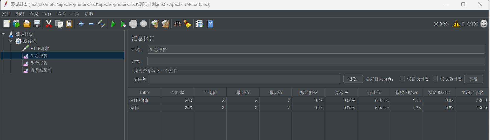 表示 100个用户在1秒内全部启动,每个用户发送1次请求。